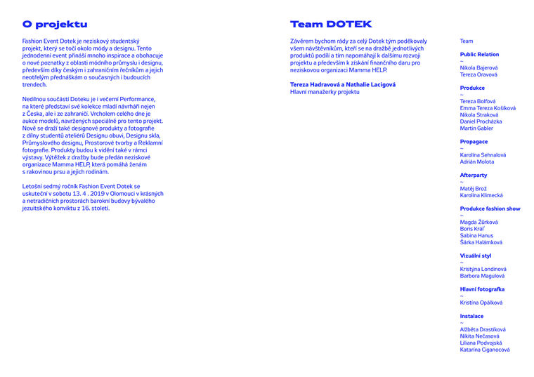Fashion event Dotek is a non-profit project organized by students revolving around fashion and design. This one-day event brings plenty of inspiration in the field of fashion industry and design thanks to both Czech and foreign speakers and their fresh talks on current and future events. Young designers not only from Czech Republic but also from abroad will present their collections during the evening performance. The highlight of the whole day is an auction of ready-to-wear collection designed specifically for Dotek. The auction proceeds will be donated to Mamma Help, a non-profit organization supporting women who fight breast cancer.
