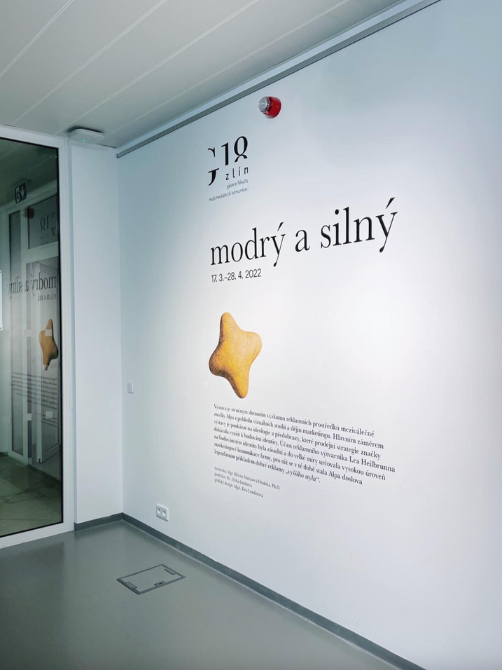 The poster for the exhibition “Blue and Strong” is a brief summary of the research on advertising materials of the interwar brand Alpa from the perspective of visual studies and marketing history. The main aim of the exhibition is to highlight the wide and diverse range of sources (ideologies and prototypes) that the brand's sales strategies have utilized to build its identity. The participation of advertising artist Leo Heilbrunn in the development of this identity was crucial and largely determined the high level of marketing communication for which the Alpa brand became a legendary example of “higher style” advertising at that time. The exhibition took place at Gallery G18 in Zlín from March 17 to April 28, 2022.